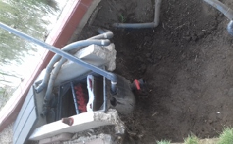 Die Erde der Seitenränder und unter dem Teich ist schon in die Pumpengrube gestürzt. Und dadurch wäre der Teich fast komplett unterhöhlt worden. Dann wäre alles nach unten gebrochen - Resterde mit Folie, Kies und Pflanzen! Und wenn unten keine Folie mehr ist, rinnt natürlich der Teich aus….